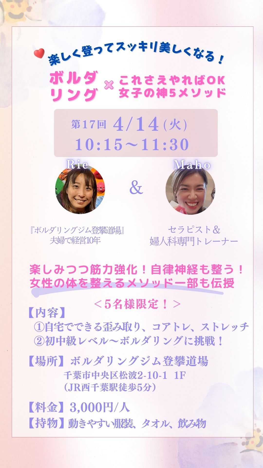 登攀道場×婦人科専門トレーナー Maho さんで、姿勢・体幹・骨盤まわりを整えながら、無理なく楽しく登れる内容にしています。 「やってみたいけど、きっかけがない」 「初心者で不安/一人だと行きづらい」 そんな方こそ大歓迎。少人数だからこそ、ペースに合わせて丁寧にサポートします。 レッスン後は、心も体もスッキリ。 “運動が続く自分”の最初の一歩に、ぜひどうぞ。 ↓↓↓ お申し込みフォームはこちら☆